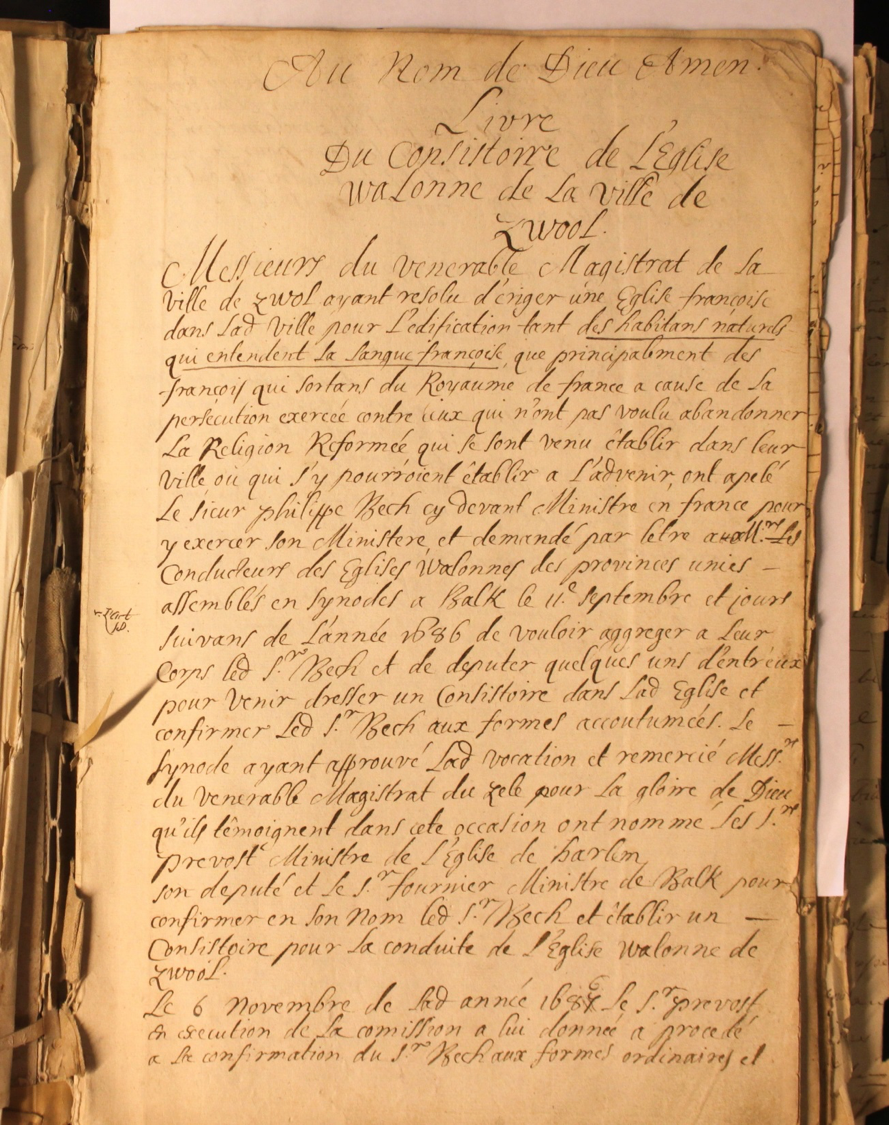 Messieurs du venerable Magistrat de la ville de Zwol ayant resolu d’eriger une Eglise françoise dans la susdite ville pour l’edification tant des habitants naturels qui entendent la langue francoise que principalement des françois sortans du Royaume de france a cause de la persecution exercée eux qui n’ont pas voulu abandonner La Réligion Reformée qui se sont venu êtablir dans leur ville ou qui s’y pourroient êtablir a l’advenir, ont apelé le sieur philippe Bech cy devant Ministre en france pour y exercer son Ministere, et demandé par letre aux Messieurs les conducteurs des Eglise Walonnes le 11e septembre et jours suivant de l’année 1686 de vouloir aggreger  le d. Sr Bech de deputer quelques uns d’entr’eux pour venir dresser une consistoire dans la susdite Eglise et confirmer le d. Sr Bech aux forms accoutumées.